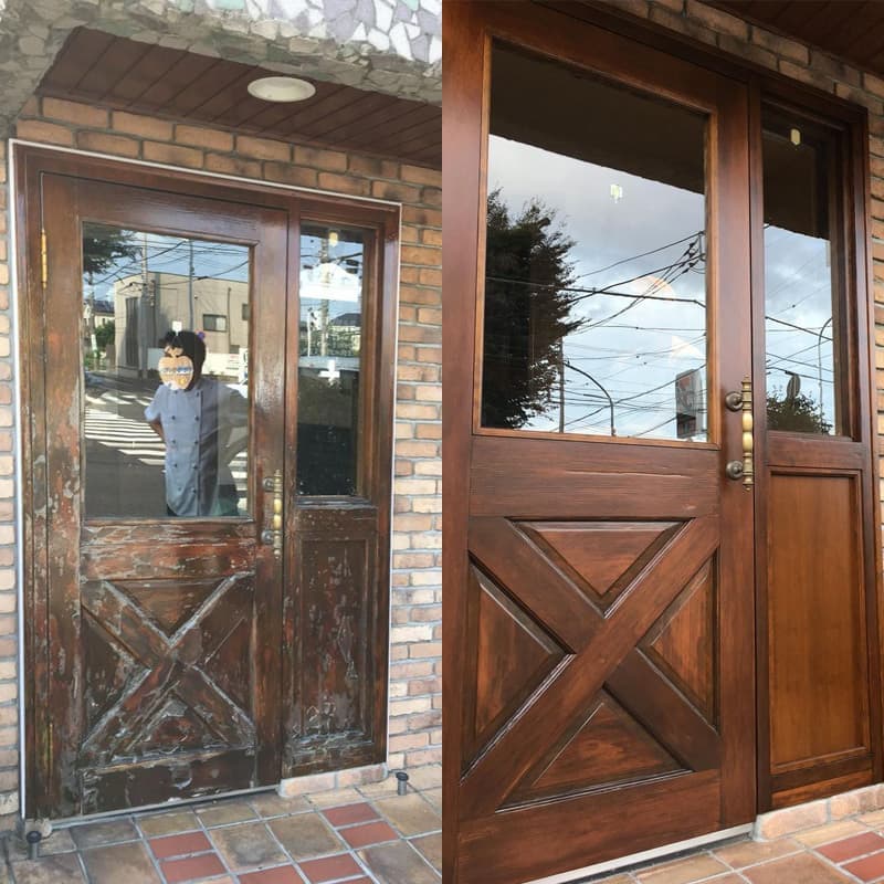 補足:全面剥離をせず「塗潰し仕上げ」にする工法もあります。 現場の状況に合わせて防犯養生(コンパネ等)を施したのち、風彩堂の工場に引き上げて施工する工法と現場で施工する工法があります。 なお、室内は塗膜が良好な場合が多いので塗膜剥離を行わずに染色による色変え、あるいは木目がある染色仕上げ木目を無くして塗潰し仕上げにする事も可能です。