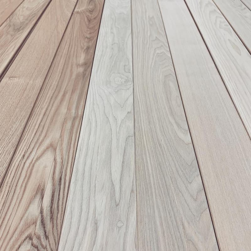 アッシュ(タモ)無垢床板材、木の質感をそのままに石鹸の油脂分で汚れをつきにくくする塗装