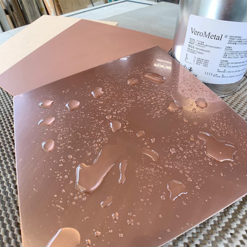 VeroMetal®︎ヴェロ・メタルは、ドイツ生まれの特殊メタルコーティングです。金属を極めて細かな粉末にし、リキッド化している点が最大の特徴です。素材を選ばず塗布することができるため、木材やプラスチックなどの質感を金属に擬似化することが可能になります。さらに、サビ付けや、ムラ出しも可能であり、ヘアライン加工をはじめとする物理的な加飾処理によって思いのままの表面処理を実現します。
