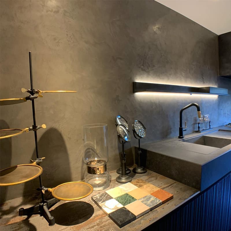 水を通さない薄く強靭な仕上げ層をつくる左官塗材で、優れた機能性と高い意匠性を合わせ持っています。屋内外の使用を問わず、表面を美しく化粧されたコンクリートや「タデラクト」のような鉱物性の表情を、お作りになる浴室、床、キッチン、家具、什器に与えます。無限の調色が可能で、あらゆる形へ塗付けられます。
