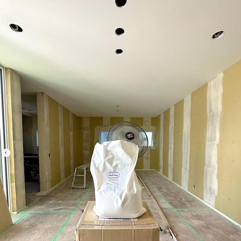 ShellClay®︎シェルクレイは、ホタテ貝を再利用して作られています。土壌改良材としても使用できるほど安心安全な北海道猿払産「ホタテ貝粉末」と食品添加物として使用できるセルロースファイバーをスサとして使用し、複数の天然デンプン糊をブレンドし強度を高めています。人工樹脂(石油由来のアクリル樹脂等)を含まず、自然に還る原材料のみで作られている廃材を出さない環境にとても優しい塗材です。輸入品のような意匠性を演出できる機能性も併せ持ち、和からプロヴァンスやサンタフェスタイルから磨きに至るまで幅広いデザイン表現が可能です。