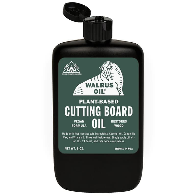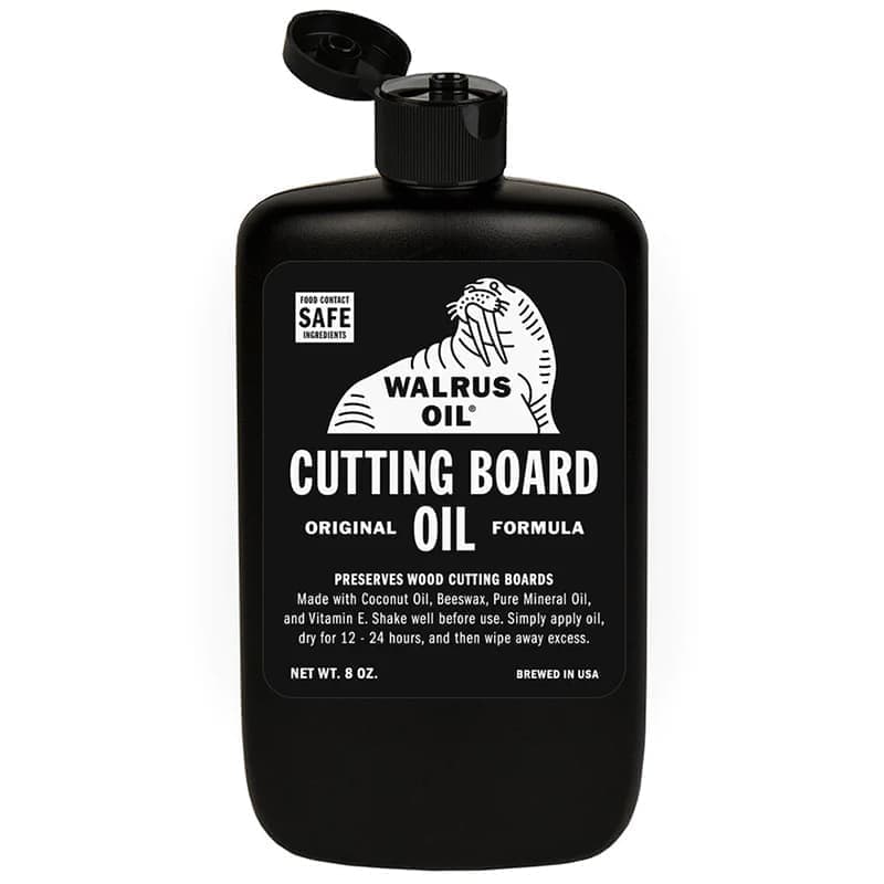 どんなに良い物でも、木製のまな板を長持ちさせるには適切なメンテナンスが必要です。定期的な処理を行わないと、乾燥したり、ひび割れたり、表面にカビが生えたりすることさえあります。ウォルラスオイルのカッティングボードオイルは木材保存油で木材の表面に浸透し、水をはじく蜜蝋で表面をコーティングし、まな板が何世代にもわたって長持ちするのを助けます。