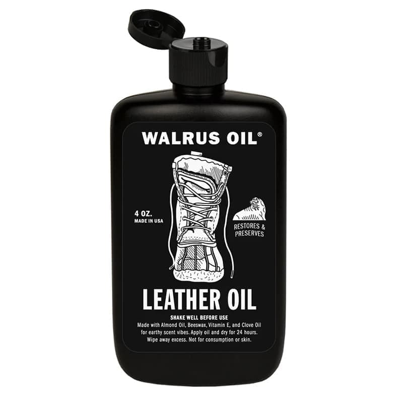 レザーオイルは、食品安全性の高いアーモンドオイル、蜜蝋、ビタミンE、クローブオイルを使用して手作りされており、素朴な香りがします。栄養価の高い植物性のオイルと蜜蝋で、古くなったブーツや革製品を生き返らせ、コンディションを整え、光沢を出し、ワックスより弱いですが、水から保護する効果もあります。あらゆる種類の革に使用できます。