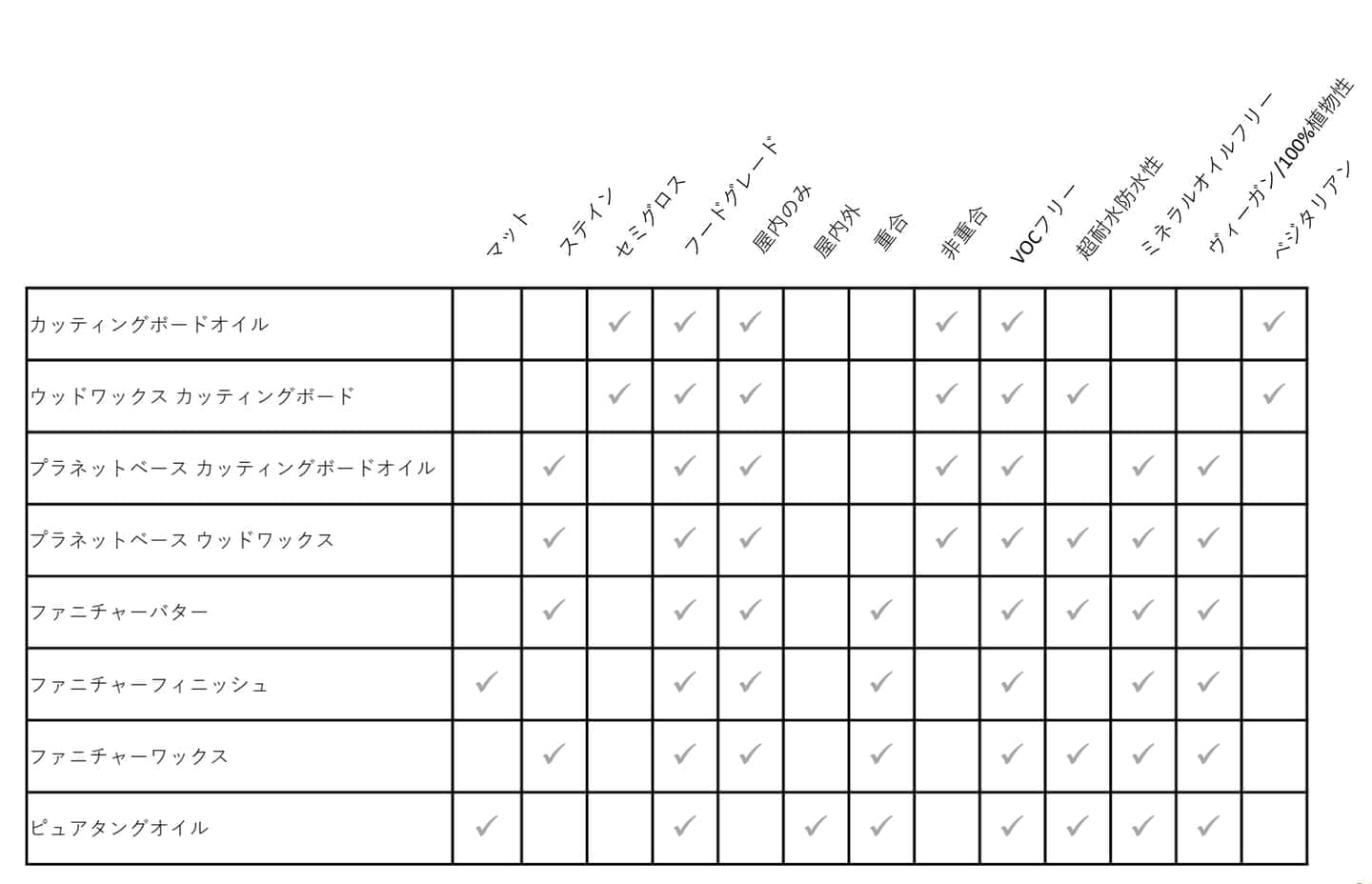 製造するすべての製品の成分は完全に公開され、食品接触面についてFADによって安全とされています。100%食品グレードであり、VOCフリー、石油系FAD溶剤や乾燥剤を使用せずに製造しています。このため、カッティングボード(まな板)、木工品、さらには赤ちゃんのおもちゃにも安全に使用できます。