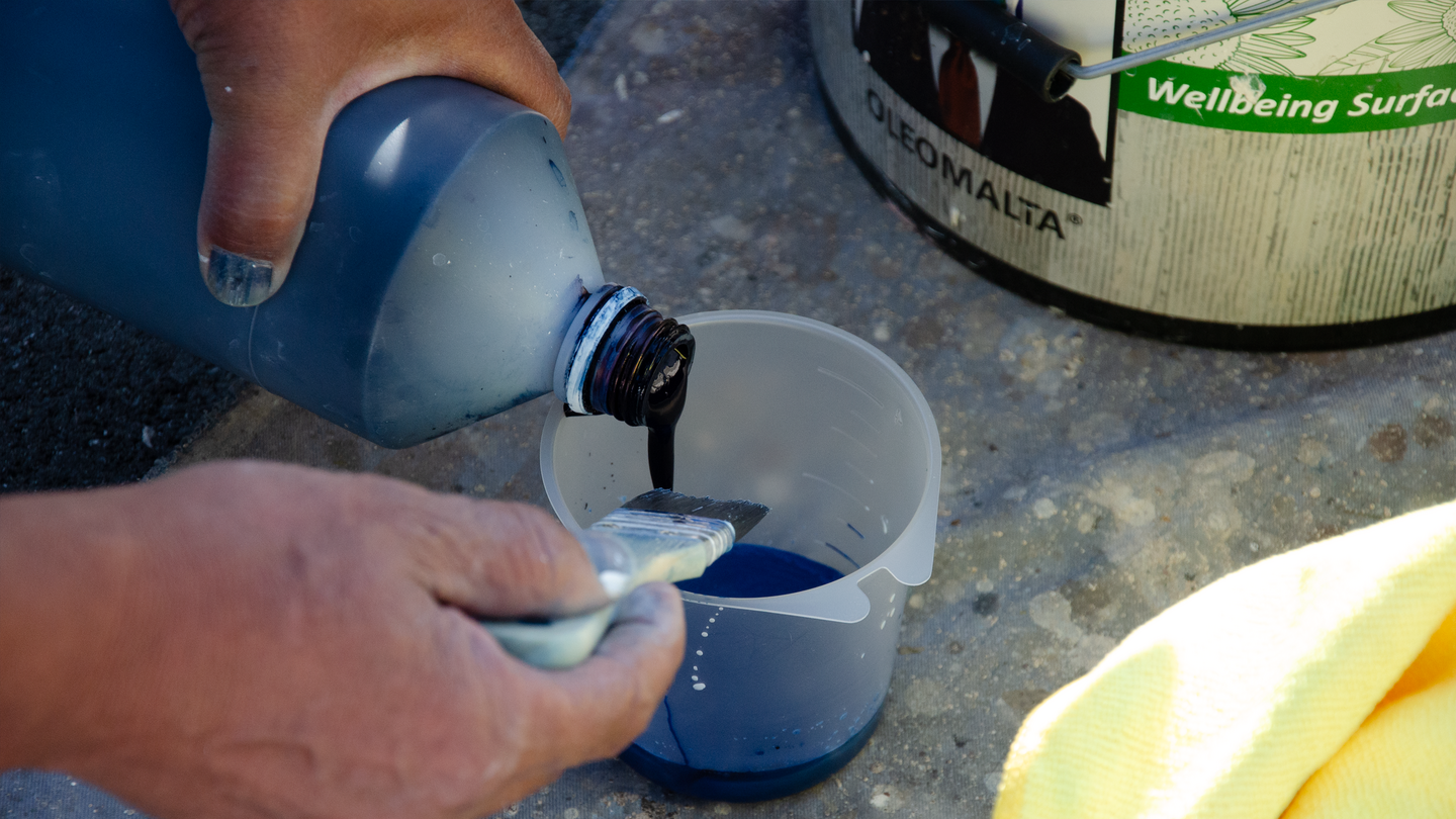 主に、藍左師モリヤレイタ氏が染料の老舗と共同開発した完全オリジナルの天然藍顔料「高純度阿波藍 / 沈殿藍」をイタリアの左官材であり、国際的食品衛生基準HACCP(ハサップ)対応の塗材「OLTREMATERIA®︎オルトレマテリア」と調合して塗材としています。